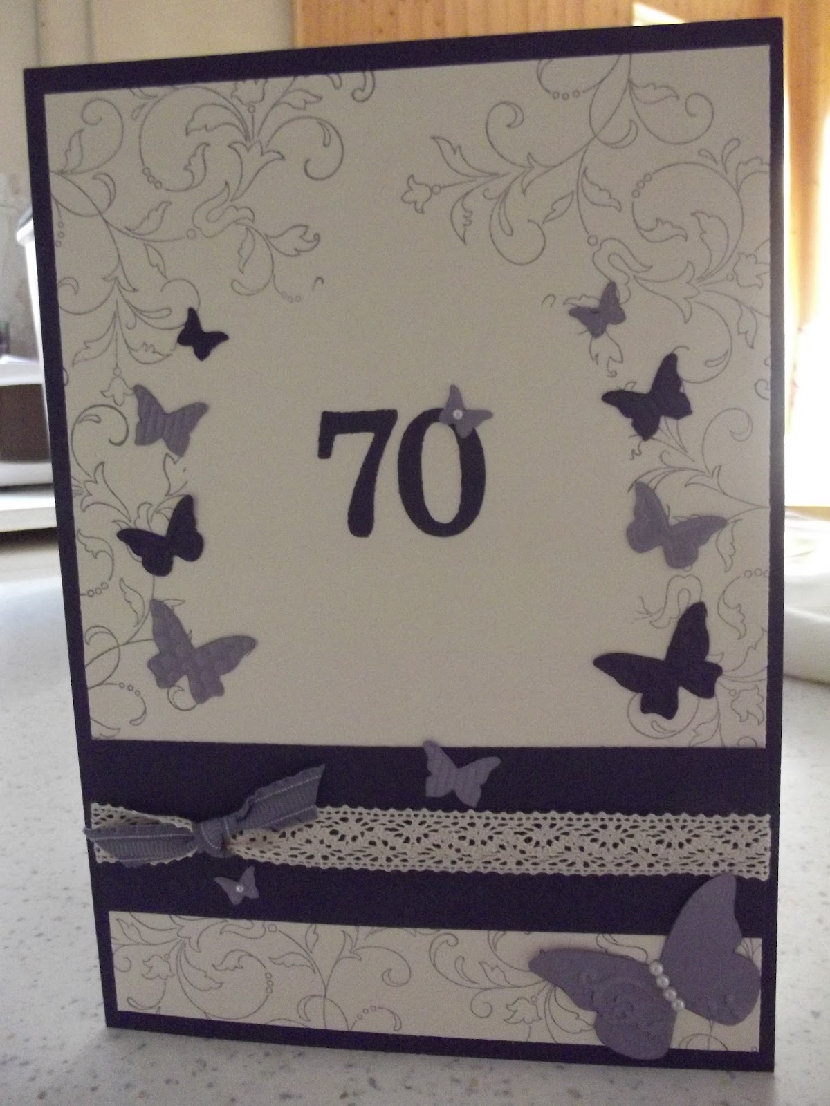 Mum's favourite colour is purple so Concord Crush and Wisteria Wonder were the obvious choice. How strange that after 2 years and just as it is about to retire I find myself liking Concord Crush!. I used the flourish from Creative Elements along with Beautiful Wings Embosslits and the numbers are from Timeless Type junior Alphabet.
